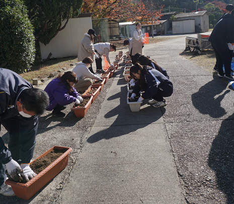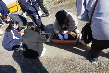 令和7年11月22日(土)、環境美化の取り組みとして「校内ガーデニング」をPTA生活環境委員会主催で実施しました。チューリップの球根をプランターに植える作業でしたが、この日はとても暖かく晴天に恵まれました。