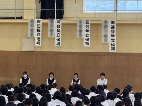 先日、第1体育館にて立会演説会が行われ、4名の生徒が信任され、令和7年度後期生徒会役員が決定しました。