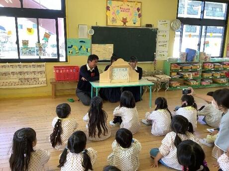 生徒たちは城陽高校周辺の地域に伝わる民話に関する紙芝居の読み聞かせと手遊び歌を中心に準備し、園児と交流しました。また、今年は園児の昼食風景も見学させていただきました。