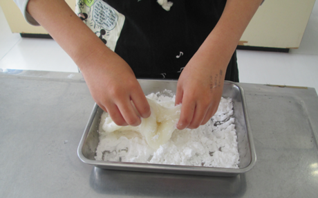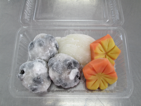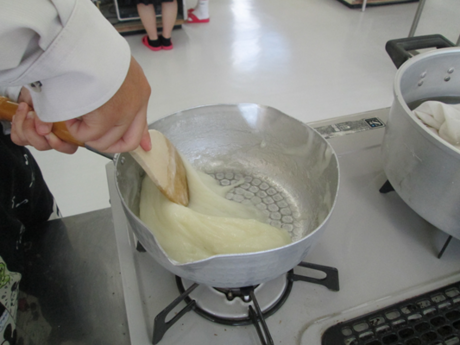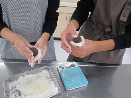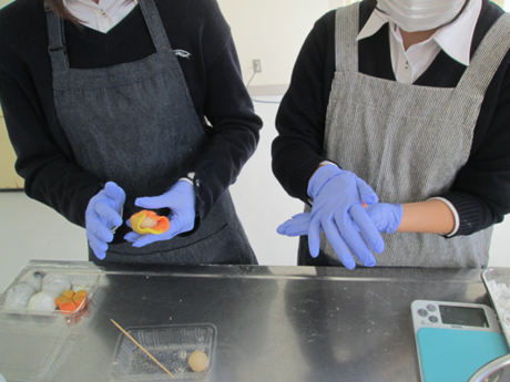立派な黒豆が入った黒豆大福と、もみじの主菓子の作り方を教えていただきました。武田氏があっという間にあんを求肥に包んだり、黄色とオレンジ色のグラデーションが鮮やかなもみじの形を美しく仕上げたりされる職人技を見せていただき、生徒も「挑戦してみたい!」と意欲を高めて和菓子作りに奮闘しました。家庭ではなかなか挑戦することのできない内容を経験することができ、和菓子作りを楽しめたようです。