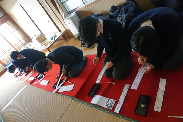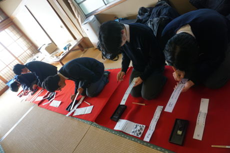 3日目は和歌を毛筆で短冊に清書しました。今年度は宮司様のご厚意のもと、水度神社で授業を行わせていただきました。「披講」(節をつけで読む)も行い、和歌を音で味わうこともできました。