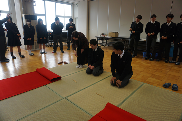 2日目は部屋の入り方や歩き方などを、しっかりと「形」を意識しながら学び、初日に詠んだ和歌を毛筆で書く練習を行いました。