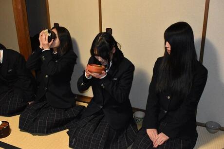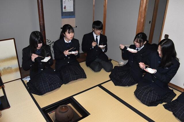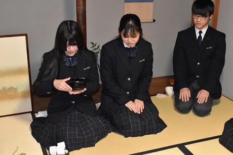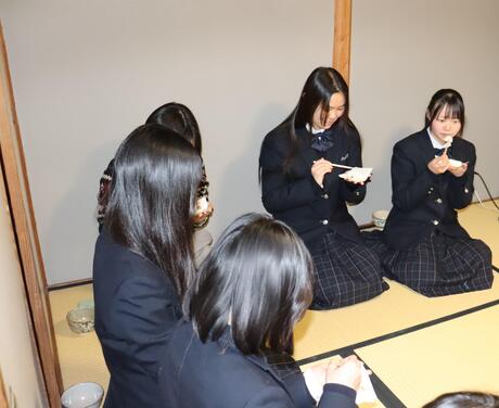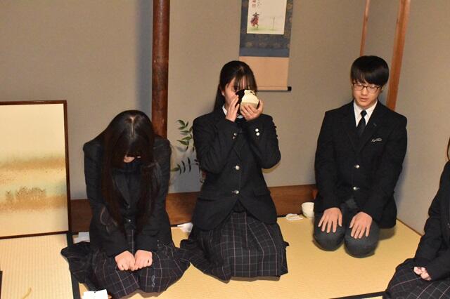 今年は3年生も参加し、全員で濃茶の回し飲みを行い、お正月のお菓子の花びら餅をいただきました。また、今年の干支である午のお茶碗で薄茶もいただきました。