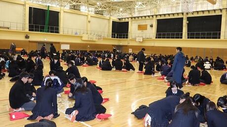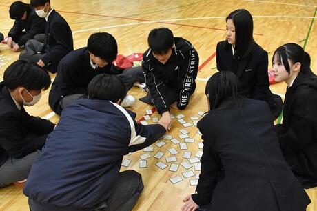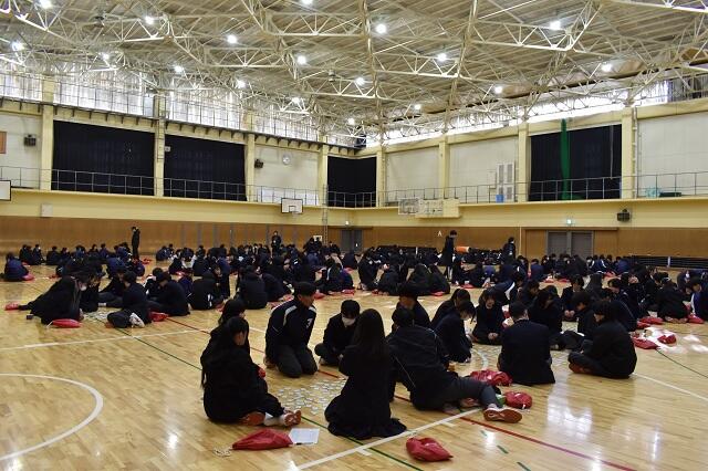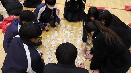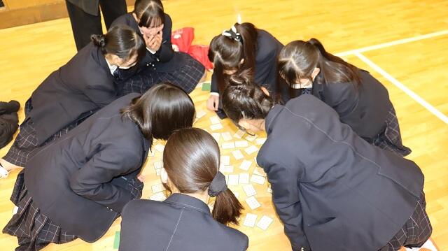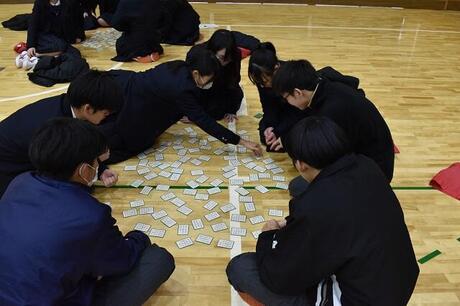 1月14日(水)、1年生が体育館で「百人一首大会」を行いました。7クラスを36グループに分けて、クラス対抗で戦いました。寒い中、みんな真剣に取り組んでいました。各グループで真剣に取り組み、最高枚数は60枚中、36枚でした!