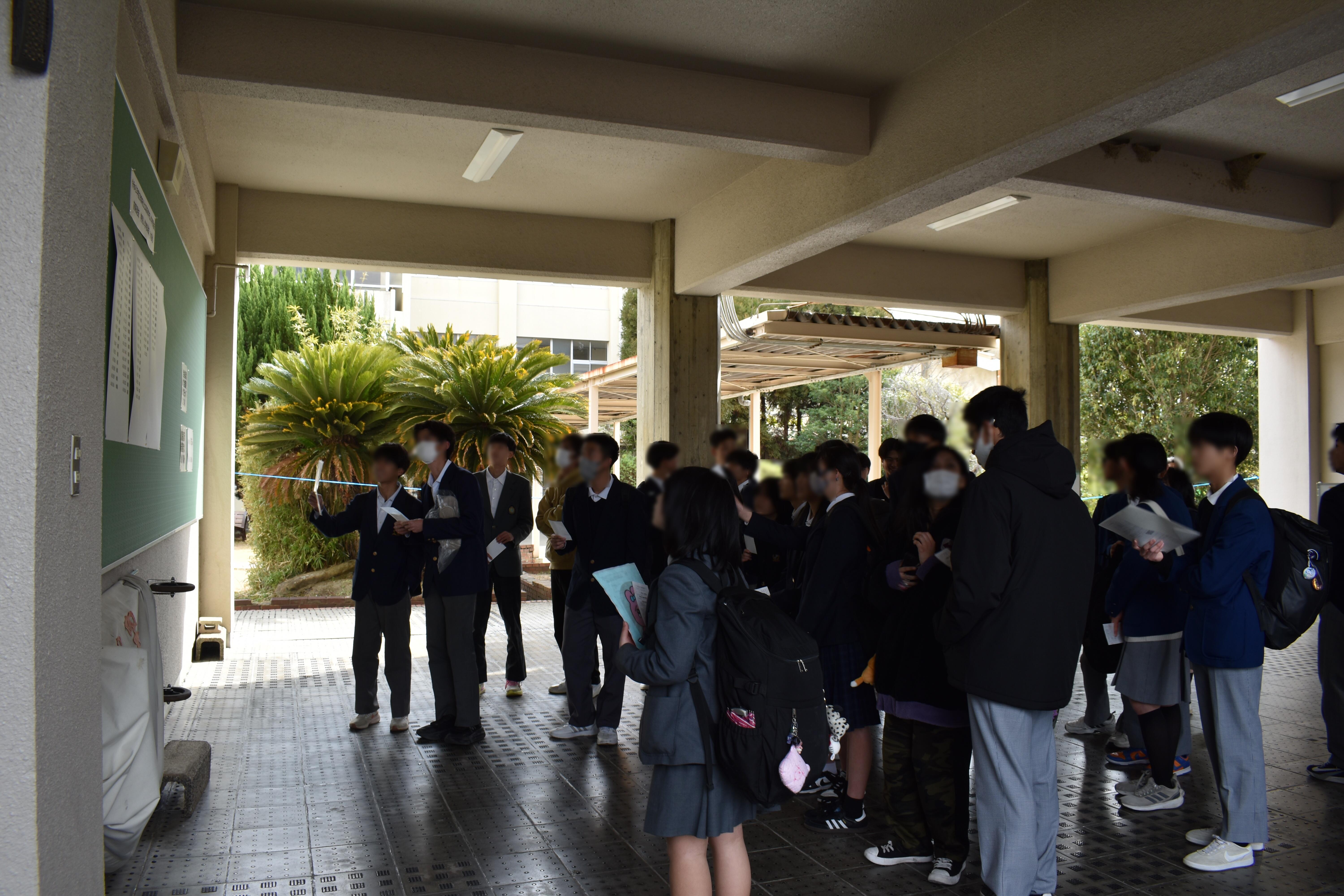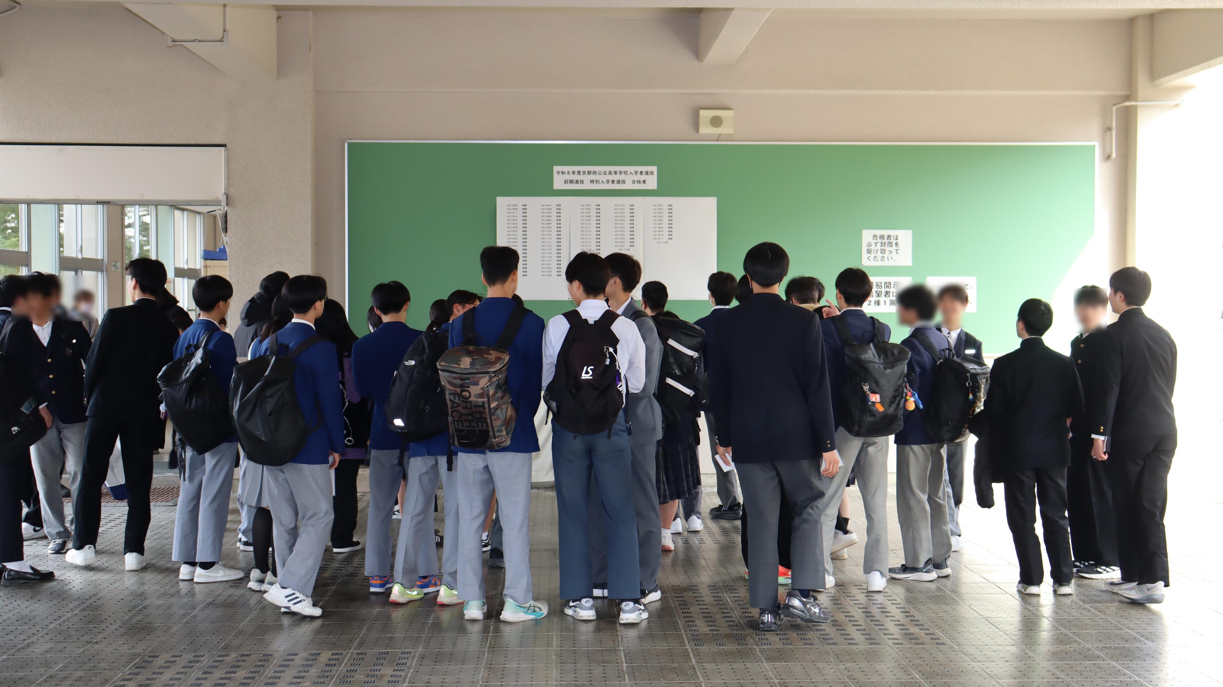 多くの中学生のみなさんが発表開始時間とともに張り出した掲示板の前に集まり、真剣なまなざしで番号を探していました。合格した受検生は、友人と喜びを分かち合い、互いにハイタッチやハグをするなど、満面の笑みがこぼれていました。
