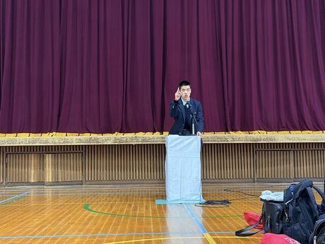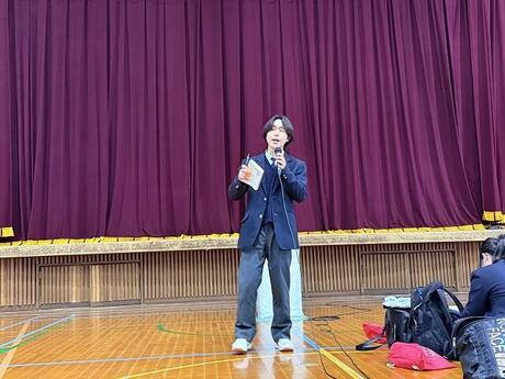 約300名の聴衆を前に、緊張しながらもジェスチャーを交えて堂々と話す姿に、大きな拍手が送られました。また、5組担任細見先生による飛び入りの発表のサプライズもあり、会場が大いに盛り上がりました。