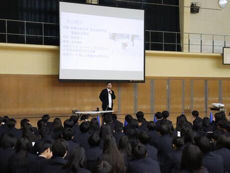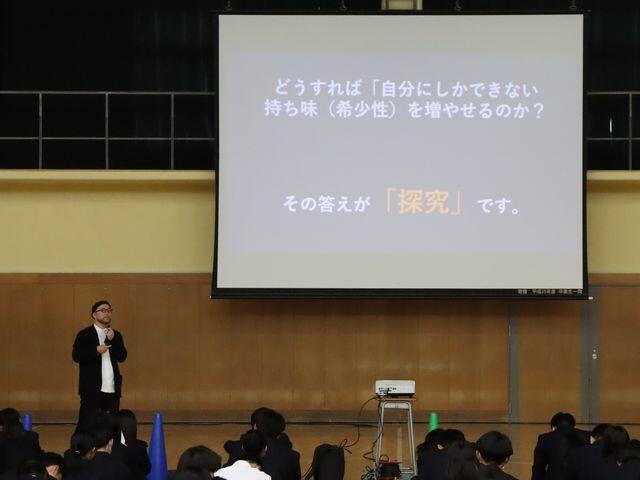 京都文教大学総合社会学部 実践社会学科の桝井雄一教授をお招きし、社会の変化・探究学習と通常の学習の違い・なぜ勉強するのか、どうして探究なのか・探究の方法について といったお話をいただき、これから始まる「総合的な探究の時間(1年生は「城陽NEXUS」)の考え方について学びました。