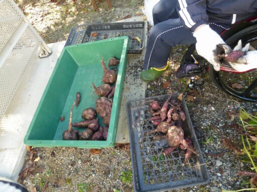 【きっと】いもほり 最近の様子 2025.11.28 10月28日(火)、5月に学校内の畑に植えたサツマイモの収穫を行いました。一人ずつスコップを使って土を掘り進めると、サツマイモは思っていたよりも深い場所にあり、折れないように慎重に掘り出すのが大変でした。掘り出した後には、丁寧にサツマイモについた土を落とす作業も行いました。収穫したサツマイモは、大きいものや小さいもの、細長いものなど形もさまざまで、自分たちの手で収穫し、手入れまでできた喜びを味わうことができました。 閲覧者数: 48