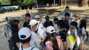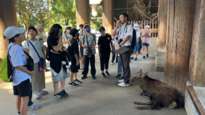 南大門の説明をする担任の足元、とても自然に鹿が居ます。