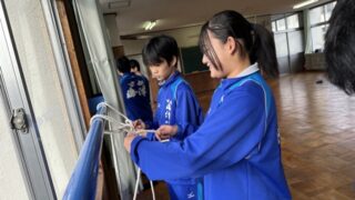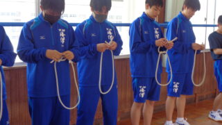 1年生が、科目「水産海洋基礎(実習)」を行いました。 本時は、これから始まる実習についてのガイダンスを行い、その後にロープワークを行いました。さまざまな種類のロープワークを覚え、日常生活にも活用してほしいと思います。