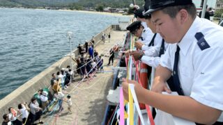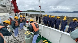 9月12日(木)7時現在、山口県角島沖を航行中です。昨日から変わりなく良い海況で船酔い等もなく生徒、乗組員ともに全員元気です。 昨晩は初めての夜間航行を体験し、他船の灯火の見え方やレーダーを用いた見張りの方法を学びました。また船外で星を...