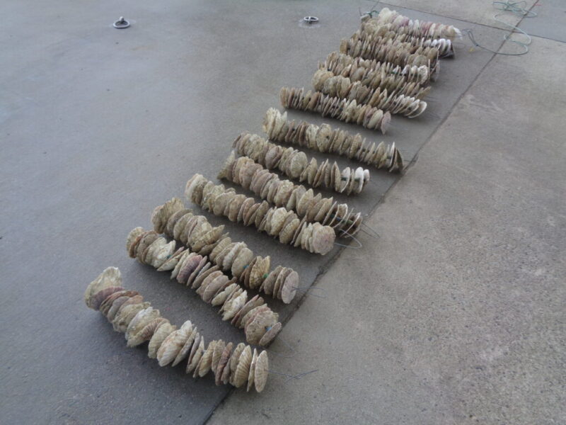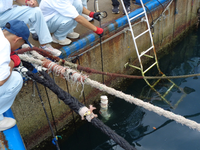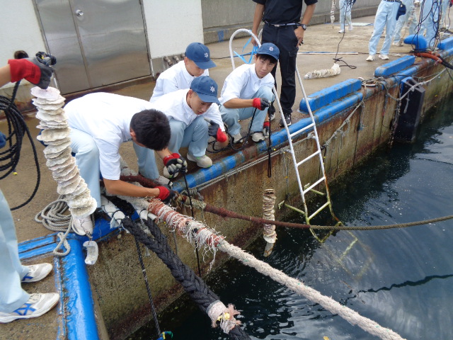 9月30日(火)、海洋科学科2年生が、イワガキの天然採苗のため本校桟橋にホタテガイの貝殻で作った採苗器を垂下しました。