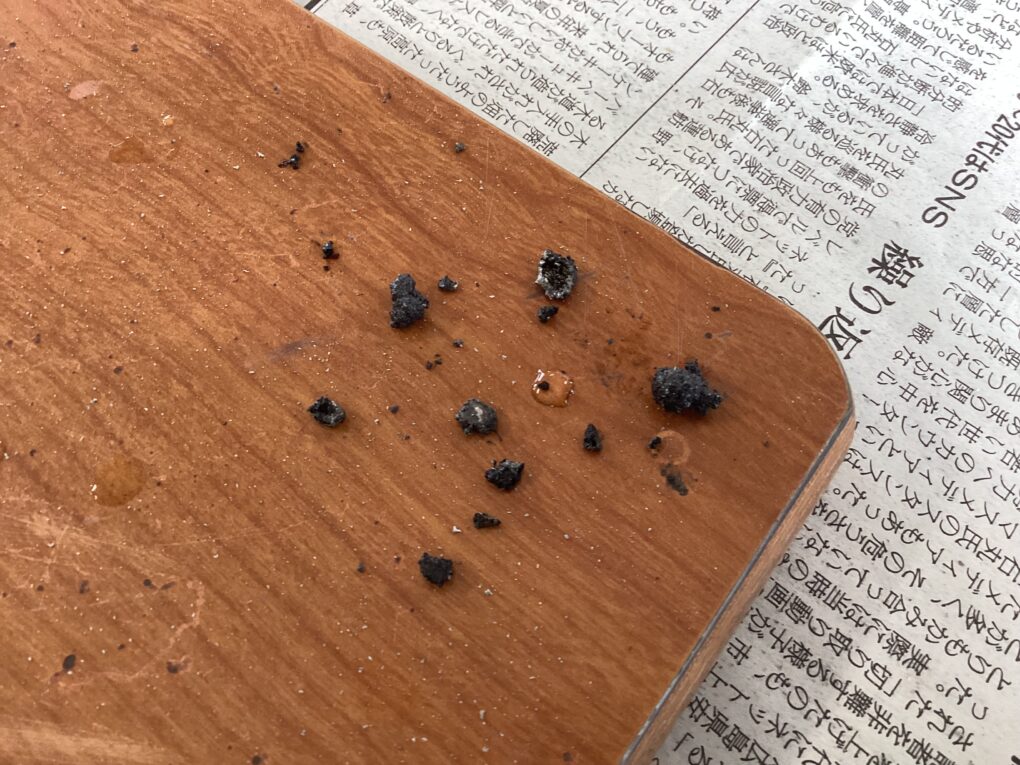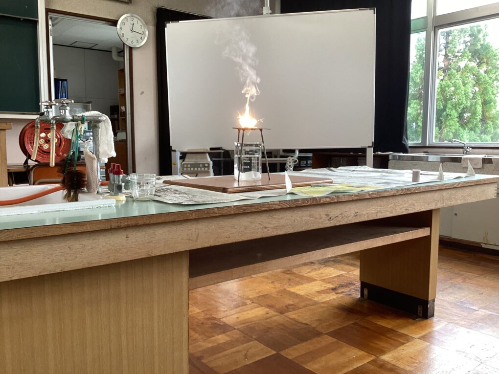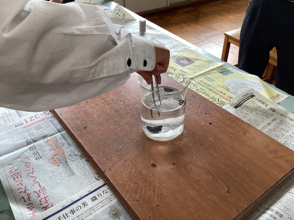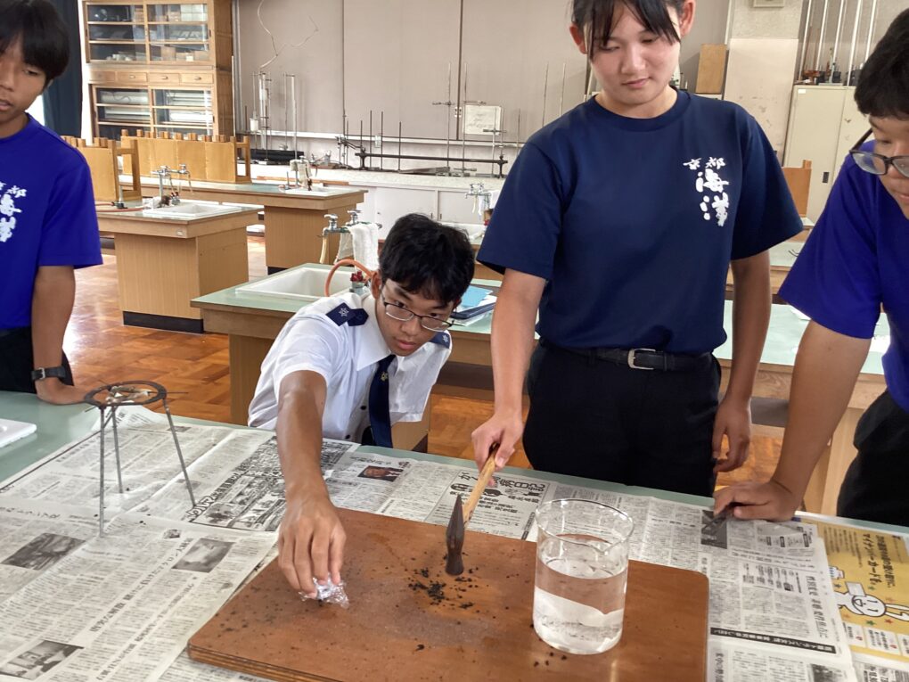 9月25日(木)に酸化還元反応の例として、テルミット反応の実験をしました。炎が上がる実験のため、十分に距離をとって安全に留意しながら行いました。アルミニウムが酸化鉄の酸素を奪い、鉄ができる反応です。アルミニウム粉末と酸化鉄(Ⅲ)粉末をよく混ぜたものを湿らせたろ紙に入れ、マグネシウムリボンを導火線として火をつけて反応させました。水中に落ちた黒い塊を取り出し、金づちでたたくと、硬く、金属光沢をもつ塊があり、これに磁石を近づけるとくっついたことから、鉄ができていることが確認できました。