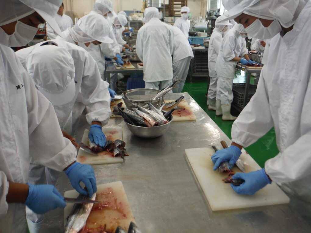 10月2日(木)、食品経済コース2・3年生が、地元水揚げのヤナギ(和名:サワラ(幼魚))を原料に、3枚卸し(1,000食超)にしています。