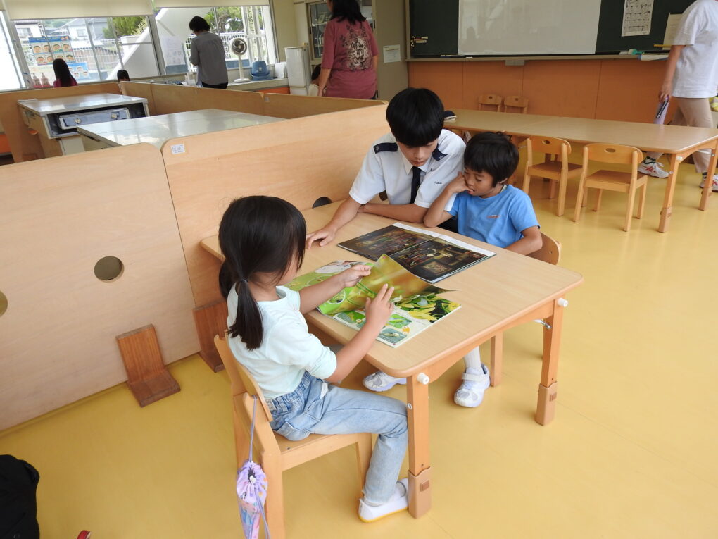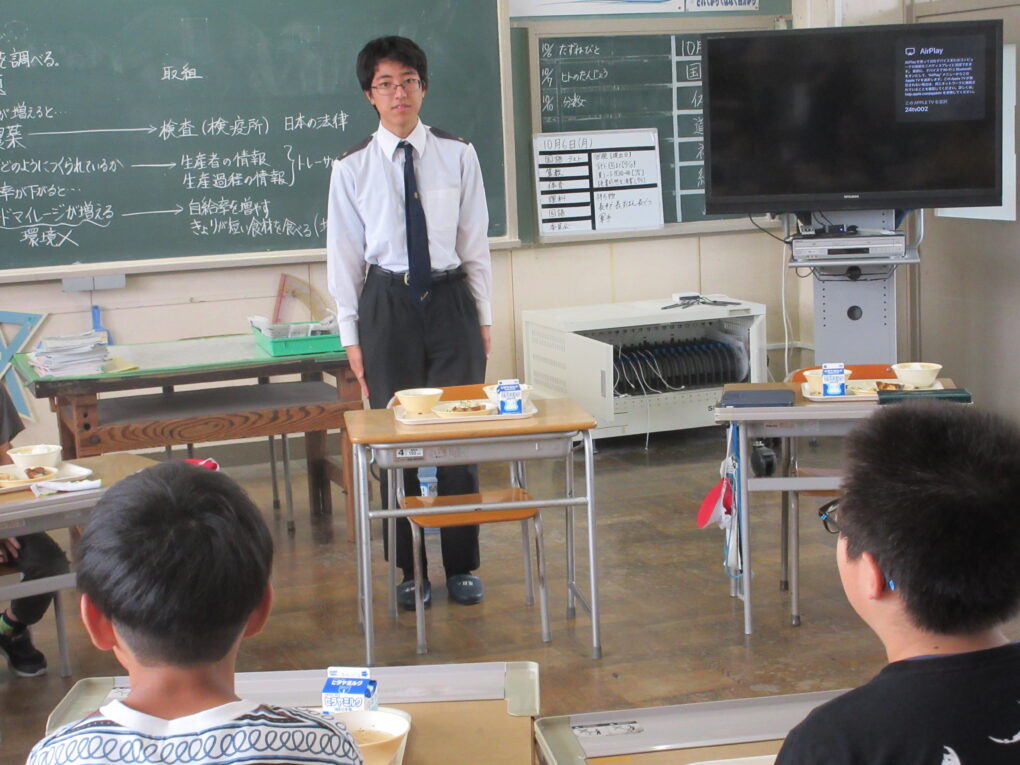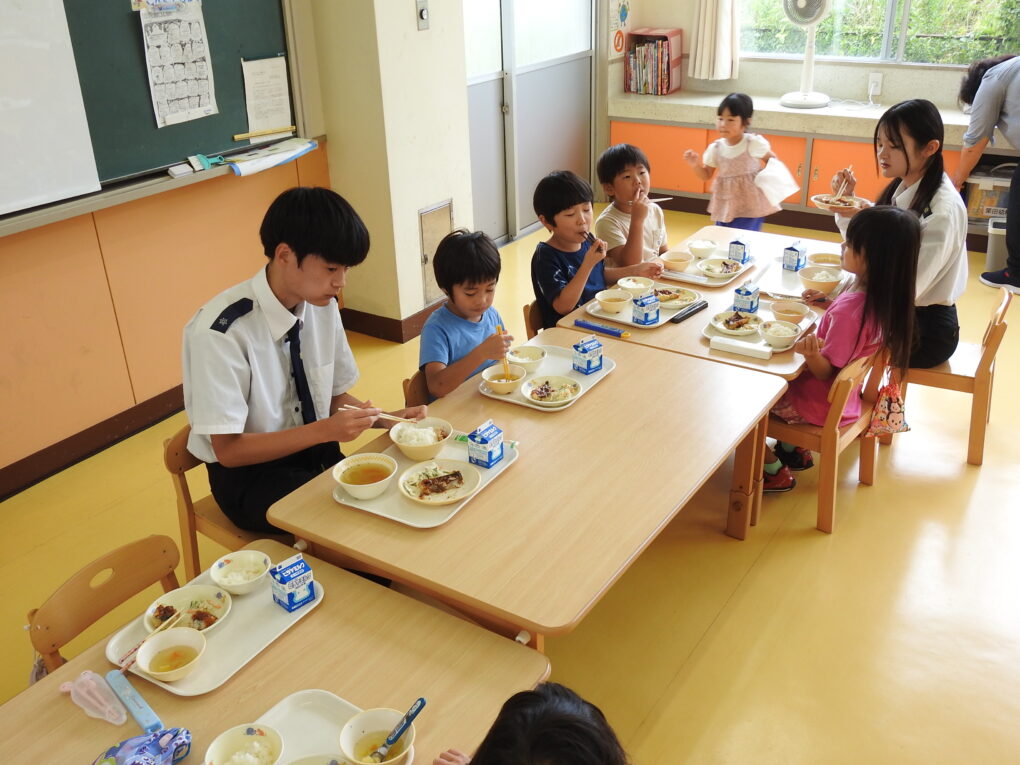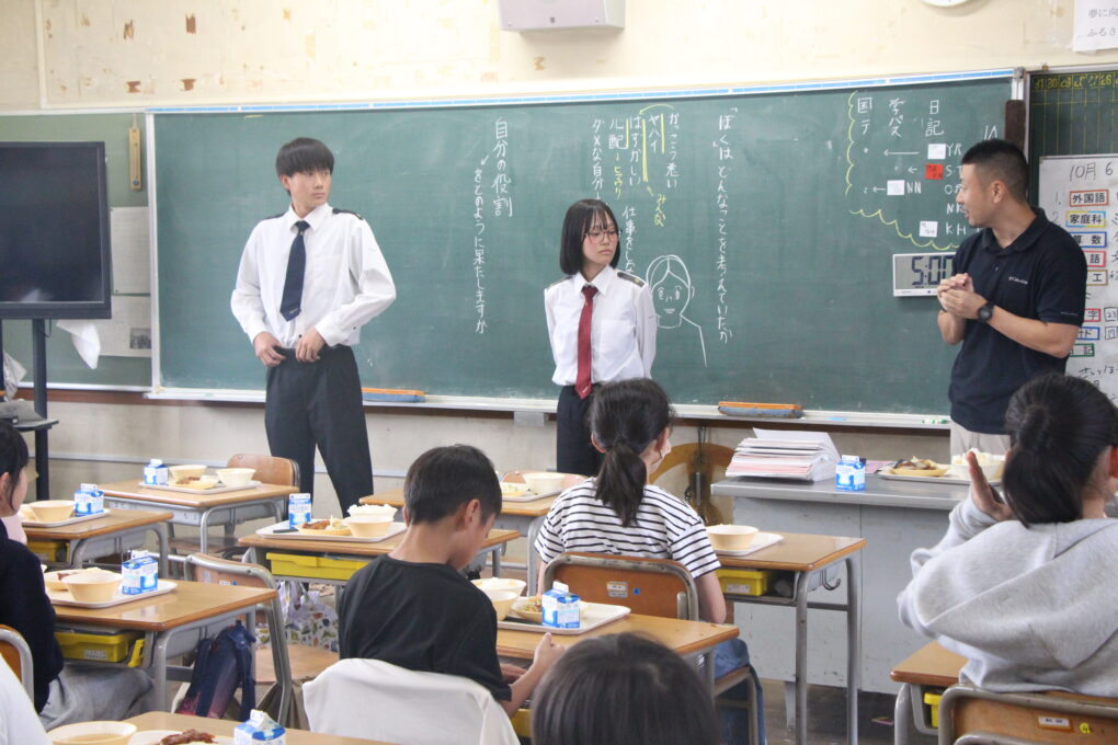 10月3日(金)、食品経済コース3年生が宮津市内の幼稚園、小学校に交流給食に行かせていただきました。この日のメニューは「ヤナギのごまケチャップソースがけ」でした。