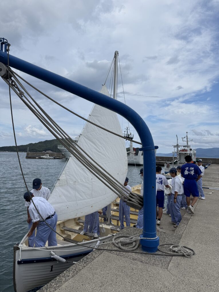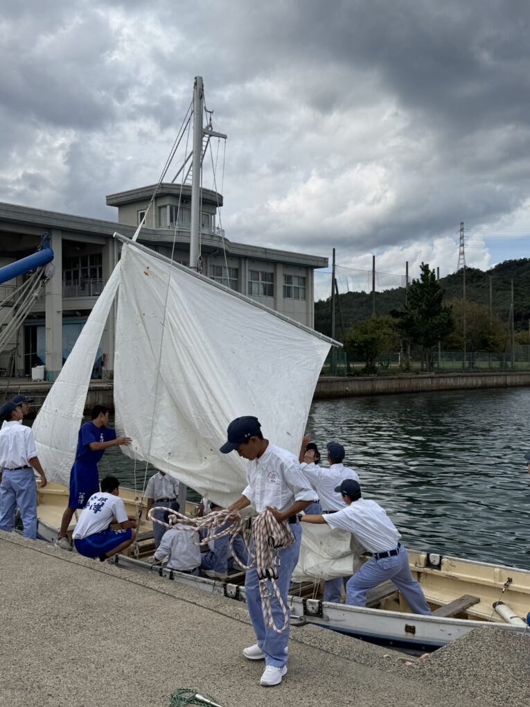 10月2日(木)、航海船舶コース2年生が「総合実習」においてカッター帆走のための艤装方法を学びました。艤装品の役割を理解し、その手順等を生徒同士で話し合い実習を進めることができました。次回の実習では、実際に沖での帆走を行う予定です。