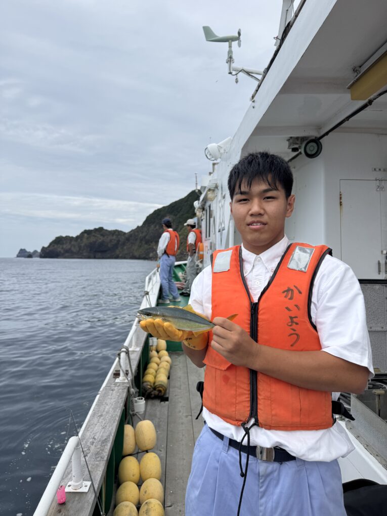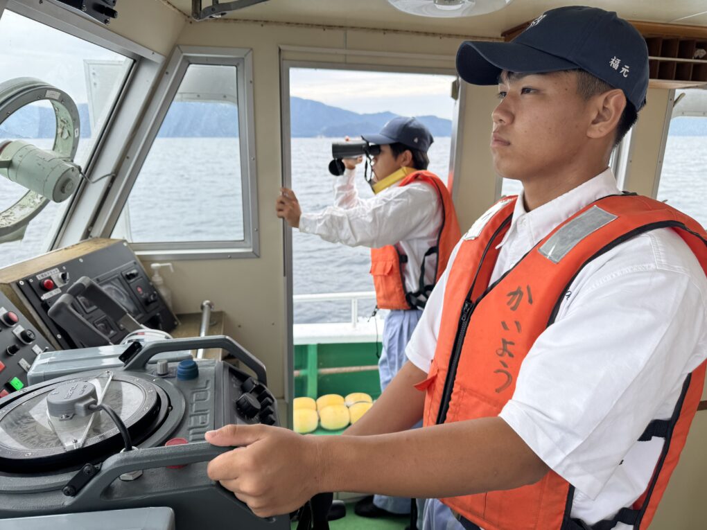 10月3日(金)、航海船舶コース3年生が実習船「かいよう」(19t)に乗船し、冠島を目指しました。航行中は生徒が操舵と見張りを担当し、冠島到着後は釣りによる資源調査を行いました。今回の実習を通して、小型船舶の操船における特性を学ぶことができました。