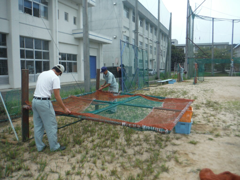 グラウンド備え付けの複数の防球ネットの修繕を、実習船「みずなぎ」乗組員にお世話になっています。