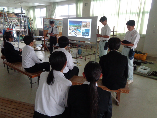海洋科学科 10月27日(月)、宮津立市栗田中学校から3年生12名の皆様が来校され、キャリアプランニング・サポートの一環で「海ごみ教室」を体験していただきました。