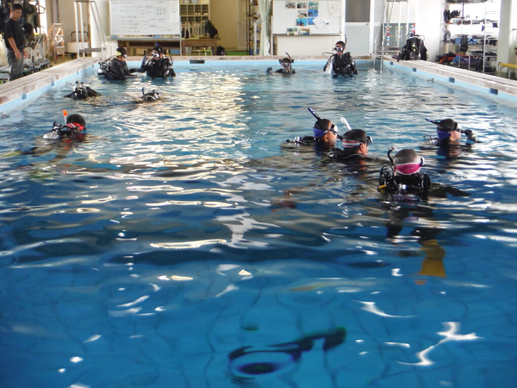 この日は、本校のプールにて、ダイビング中にエアー切れを起こした場合、バディで助け合う方法(オクトパスブリージング・アセント)等について実習しました。