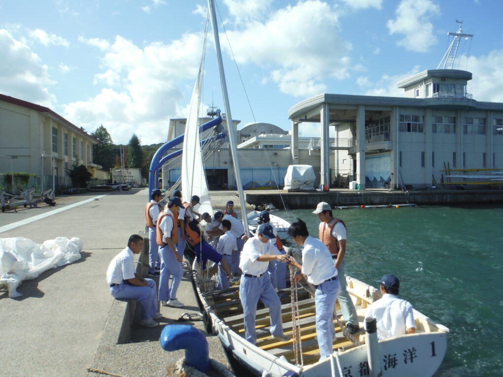 10月9日(木)、航海船舶コース2年生「総合実習」において、カッター帆走のためのセイル等の艤装を行っています。帆走では、オールで漕ぐ漕法とは違い、風の力を利用します。風が強い日でした。