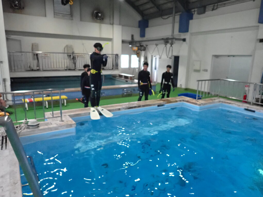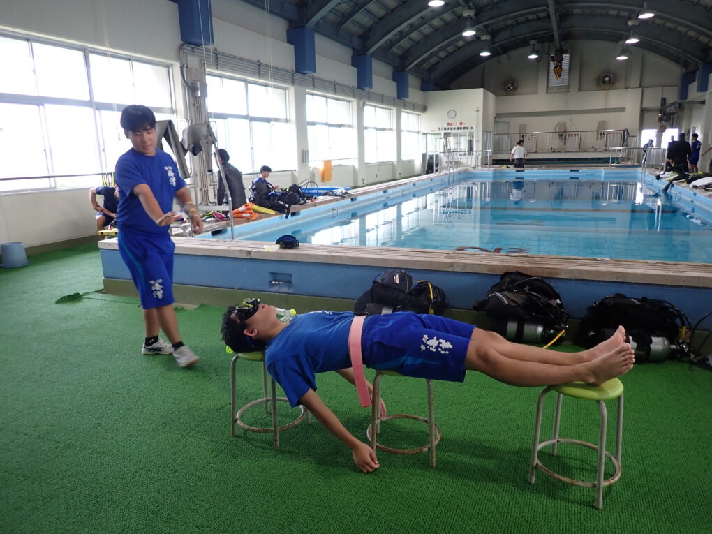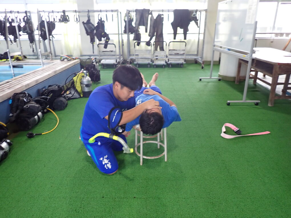【海洋技術コース3年生】ダイブレスキュー 海洋技術コーススクーバダイビング中に意識を失ったダイバーを救助するという想定です。 2025.10.23 10月14日(火)、海洋技術コース3年生「ダイビング」の様子です。 本時は、ダイブレスキューを行いました。 スクーバダイビング中に意識を失ったダイバーを救助するという想定です。 陸上で繰り返し手順の確認を行いました。 救助!! 溺者に襲われないために、まずは逆向の姿勢で意識の確認を行います。 Post Views: 17