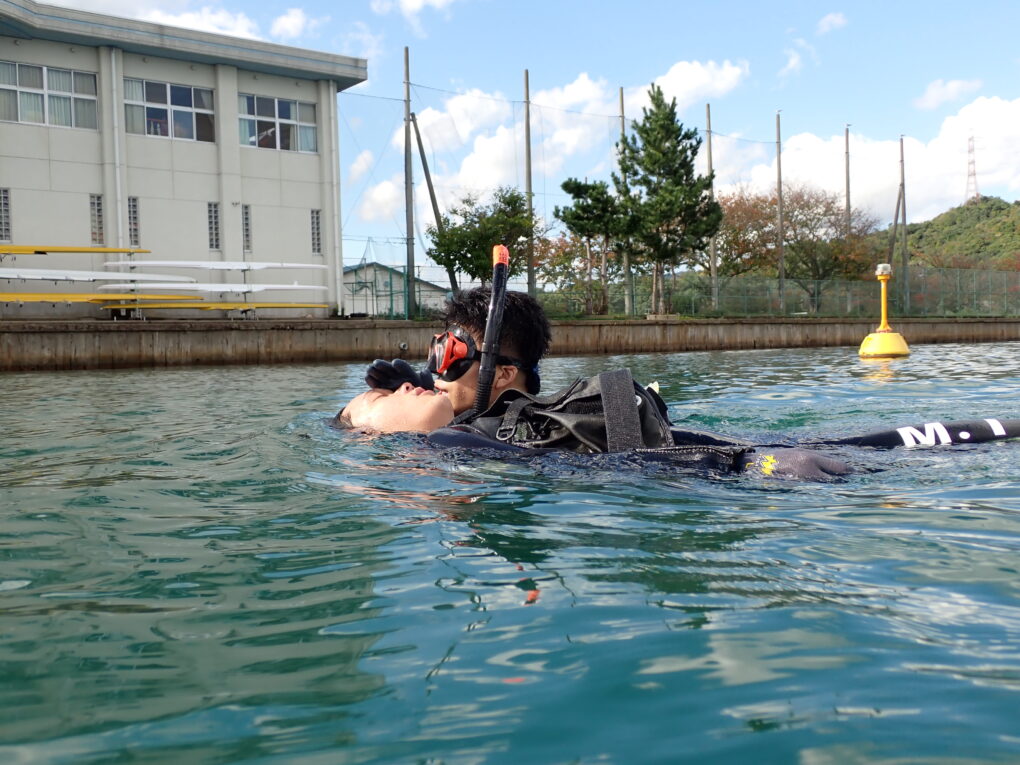 【海洋技術コース3年生】ダイビング 海洋技術コース救助!! 2025.11.08 10月28日(火)、海洋技術コース3年生「ダイビング」の様子です。 本時は、上級ダイビングライセンス取得のために、レスキューの実技試験を行いました。 救助!! 迅速にエントリー。 要救助者を見失わないように、ヘッドアップクロール。 要救助者がパニックになり、襲い掛かられないために、逆向の姿勢。 浮力確保。 安全な場所まで運搬。 Post Views: 12