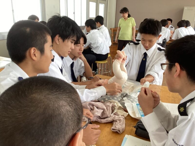 普通教科10月6日(月)、家庭科の授業で、「子どもの発達と保育」をテーマに、赤ちゃん人形を使った実習を行いました。生徒たちはグループになり、赤ちゃんを優しく抱き上げたり、慎重におむつを変えたりと、実際の育児を体験しました。