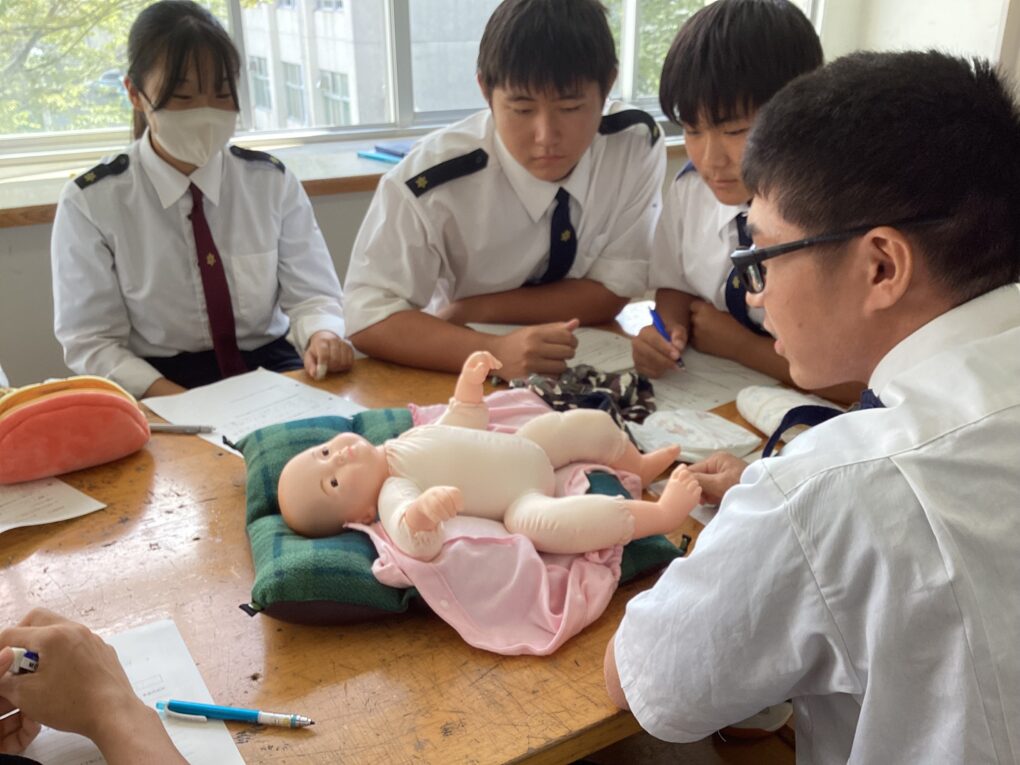 10月6日(月)、家庭科の授業で、「子どもの発達と保育」をテーマに、赤ちゃん人形を使った実習を行いました。生徒たちはグループになり、赤ちゃんを優しく抱き上げたり、慎重におむつを変えたりと、実際の育児を体験しました。