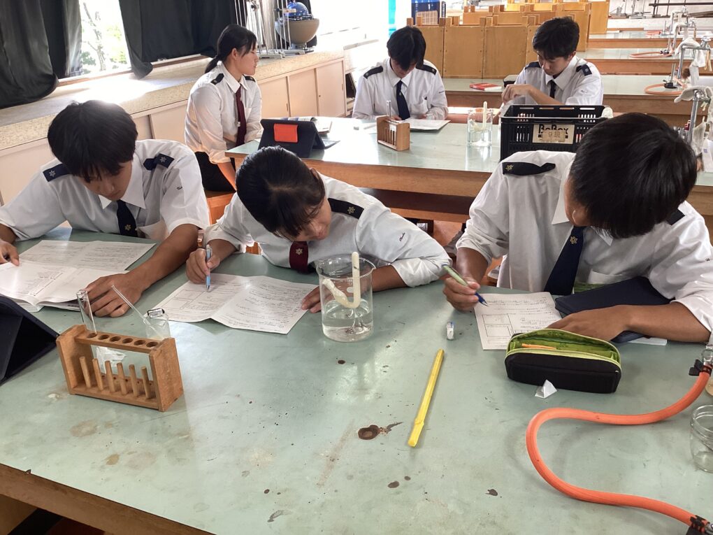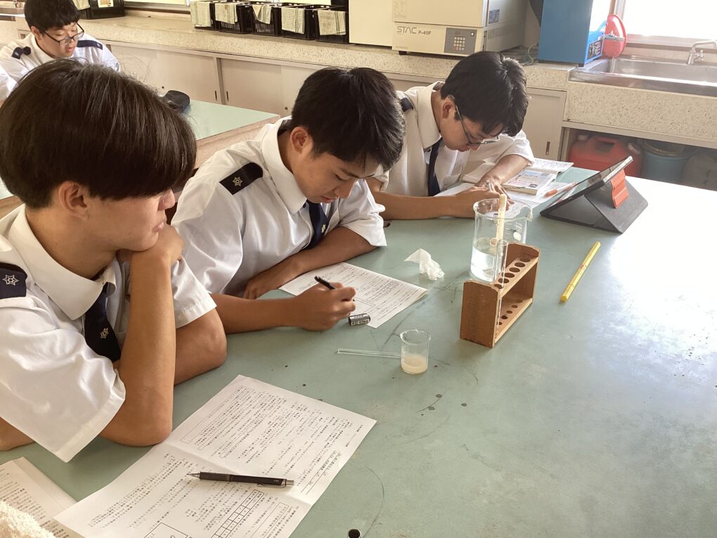 10月9日(木)に、海洋科学科3年生「生物」の授業でドライイーストとグルコース水溶液を用いたアルコール発酵実験を行いました。生徒たちは、初めて見るキューネ発酵管を、「なんだろう」と思っていたみたいでした。においを嗅ぐことも実験操作の1つでしたが、「くさい」、「納豆みたい」と言っていました。40℃の湯につけて実験しましたが、あまり発酵が進まず、発生気体は多い班で5mL程度でした。実験後の液体のにおいも嗅いでもらいましたが、あまり強いアルコール臭は感じなかったようです。