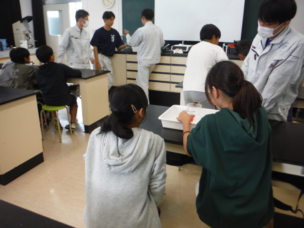 この日は、栽培環境コース3年生生徒が、つくり育てる漁業について説明後、人工イクラ作りの実験をしていただきました。また、栽培漁業実習棟の飼育生物も見学していただきました。