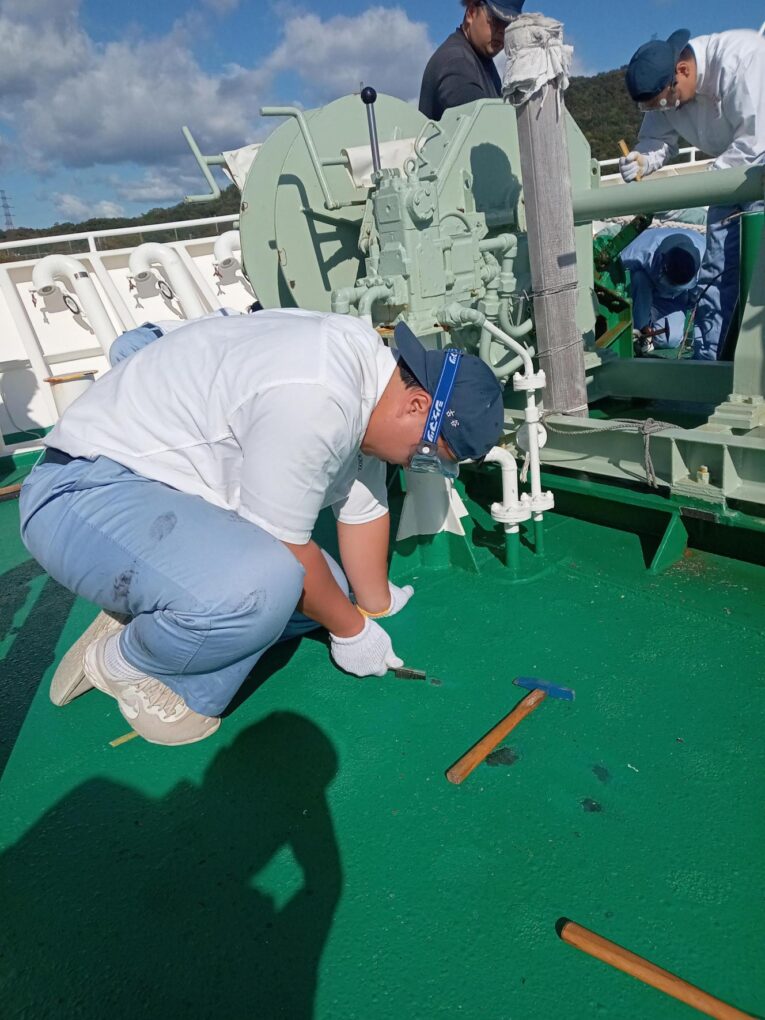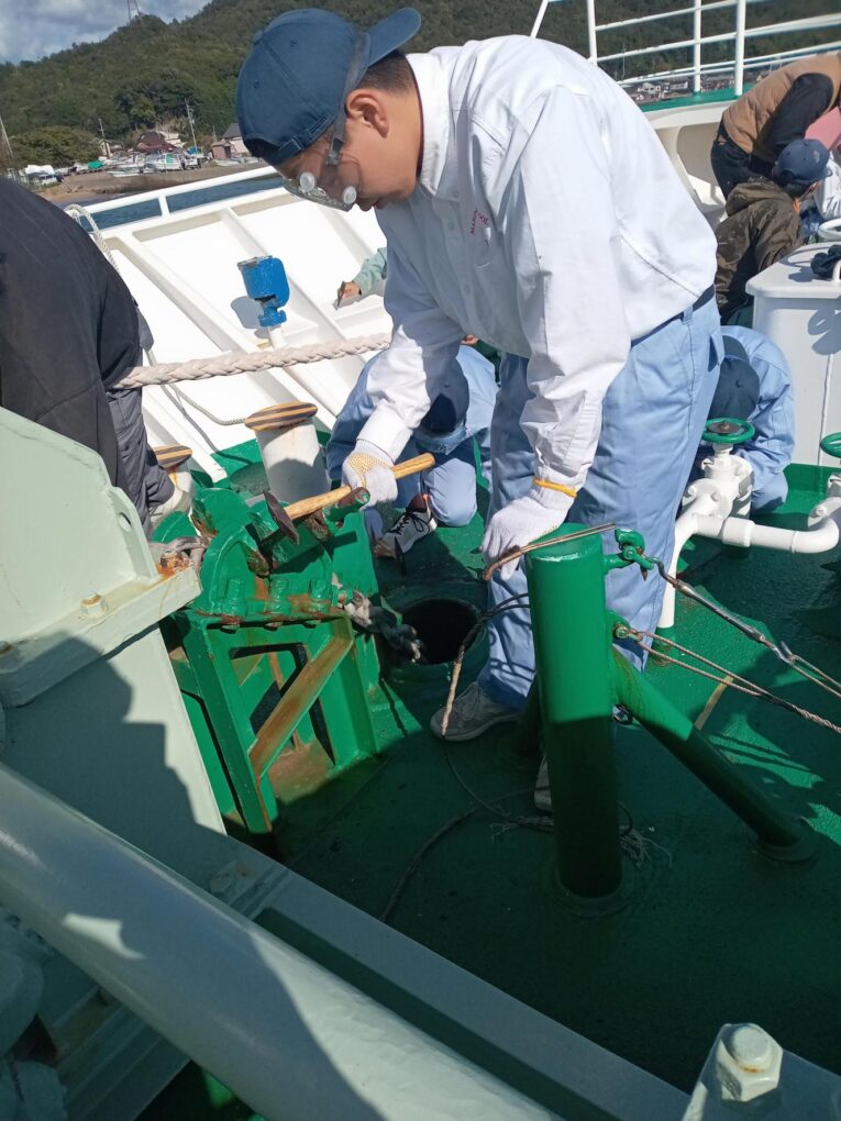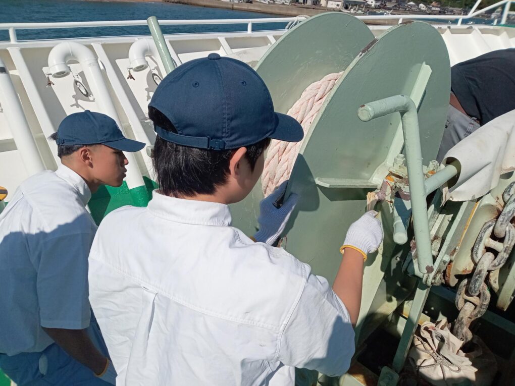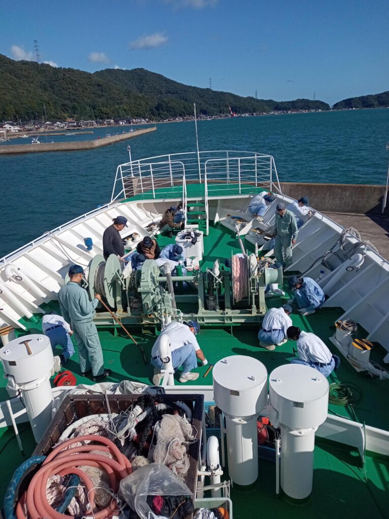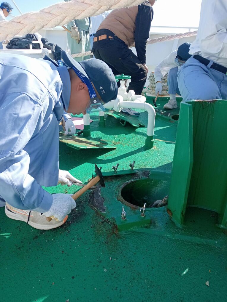 2船 錆打ち塗装実習(みずなぎ) 実習船 2025.11.11 10月23日(木)、航海船舶コース2年生が「総合実習」において、実習船「みずなぎ」の錆打ち塗装実習を行いました。 鉄製船体の錆びた部分の錆びを取り、塗装する船体のメンテナンス業務について学びました。 Post Views: 10