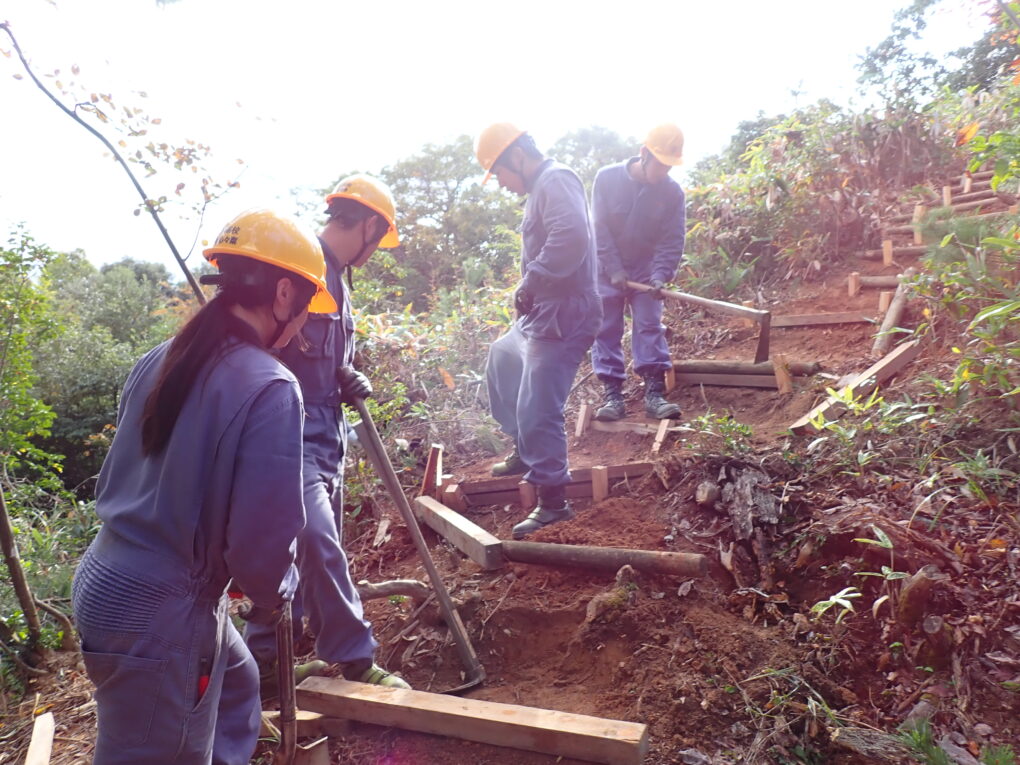 今回は、起伏のある山の斜面に遊歩道の整備をしました。先輩たちが取り組んできた構造物にも励まされながら、好天に恵まれた秋の3日間、心地よい汗を流し満足感ある成果が得られました。