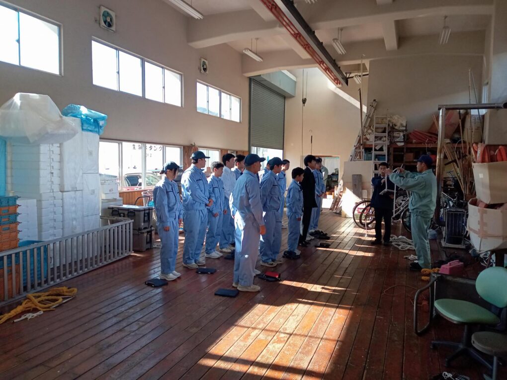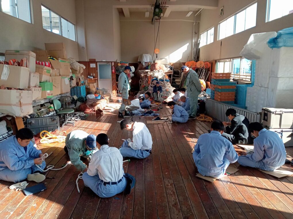 実習船11月20日(木)、航海船舶コース2年生が「総合実習」においてクロスロープのアイ加工を行いました。4本のストランドを適切な形で適切な箇所に組み込ませる過程で多くの生徒が苦労しましたが、最終的には全員が完成させることができました。大型船ではクロスロープを使用することが多く、就職しても役に立つのでとてもよい学びとなりました。