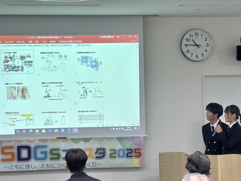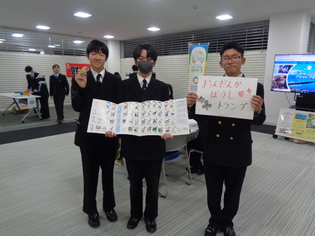 当日は、SDGs PRトークでの司会や環境関連研究・探究活動のポスター発表の他、学校紹介パネルの説明、子ども用遊び場ブースの運営など本校生徒が主体となって多彩な企画を運営しました。多くの市民の方に対して、持続可能なまちづくりの一環として地域の未来を考えながら本校も活動していることをPRさせていただきました。
