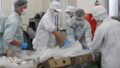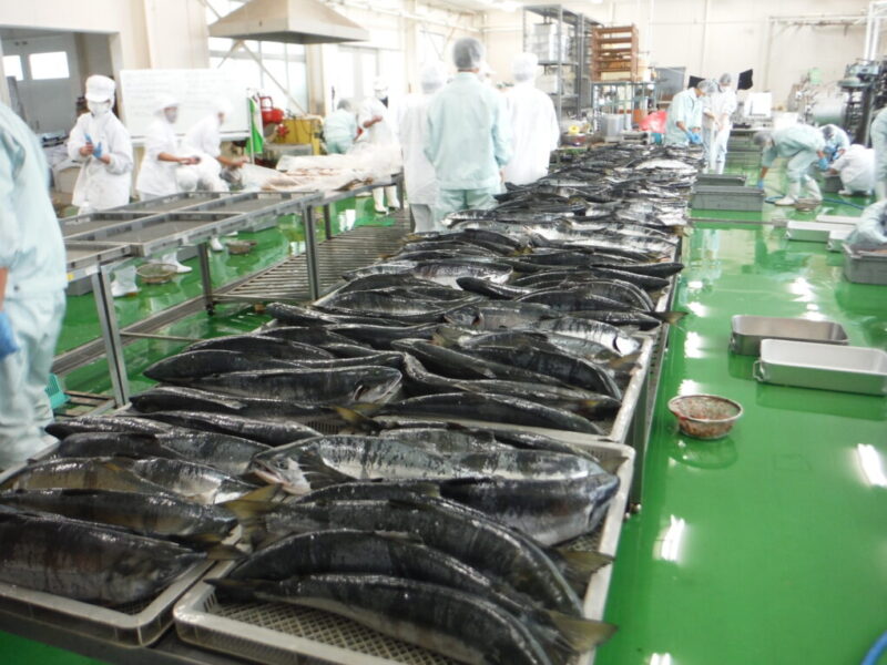 この日は、海洋科学科及び食品経済コース2年生が、カナダ産のベニサケを用いて内臓除去・洗浄後、塩をすり込む工程に取り組みました。