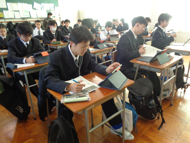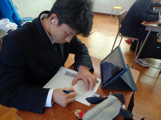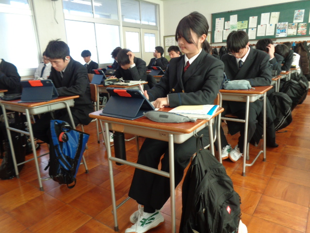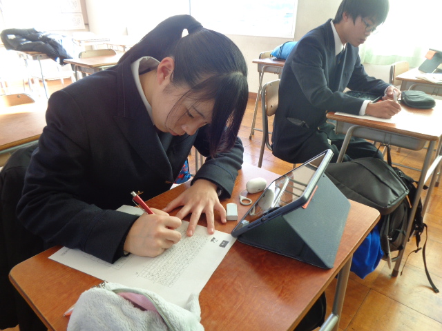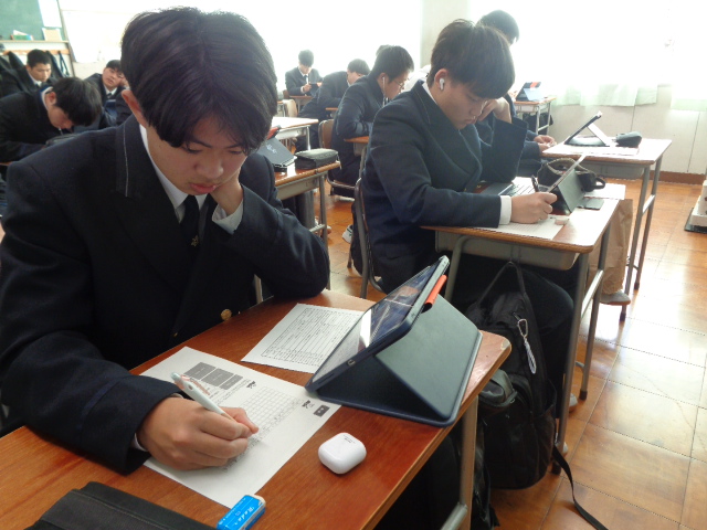 12月10日(水)、LHRの時間1・2年生が学習用端末とスタディサプリを活用して、小論文対策として文書表現力を向上させる取組を行いました。小論文とは何かを学んだ後、実際に課題テーマの小論文を作成し、ルーブリックで自己評価を行い文章力を高めました。