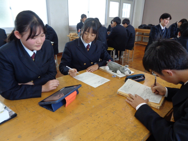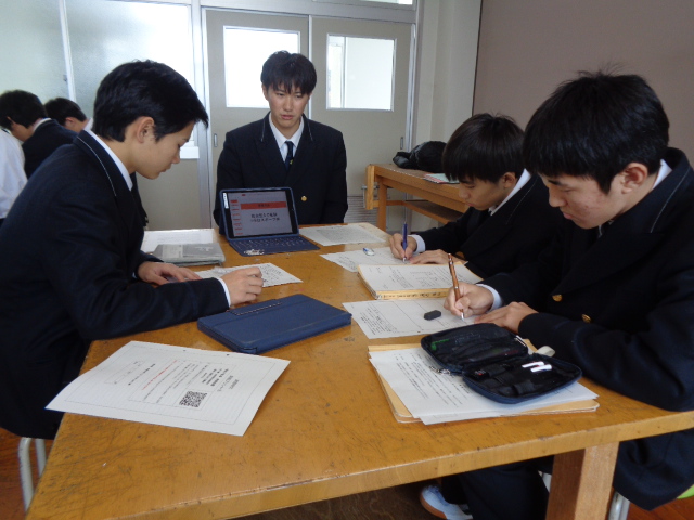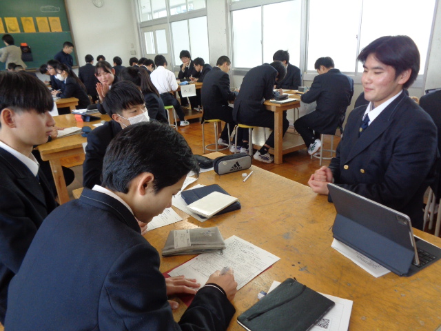 海洋科学科では、2年海洋科学科の生徒も含め、3年生の先輩から進路講話を聴講しました。さまざまなことに意欲的に取り組み実績を積み上げることの大切さや、進路に向かって学習時間を確保することなど、それぞれが自分の体験談を講話し、後輩に激励を行いました。