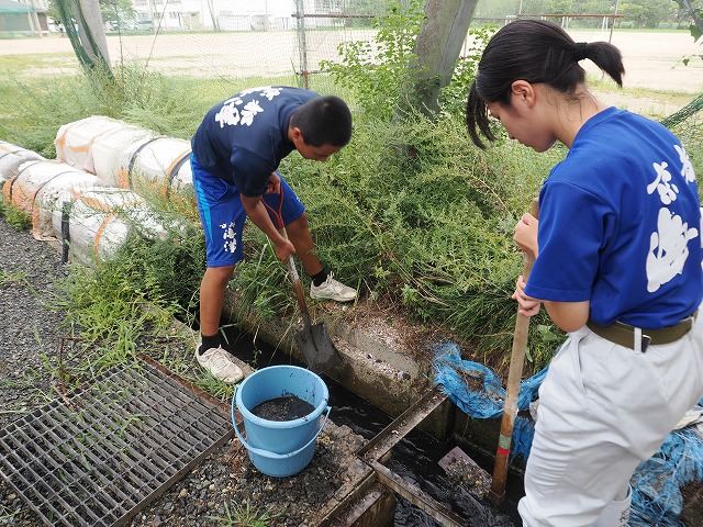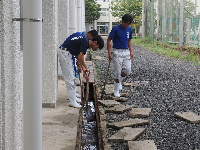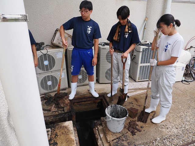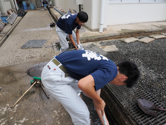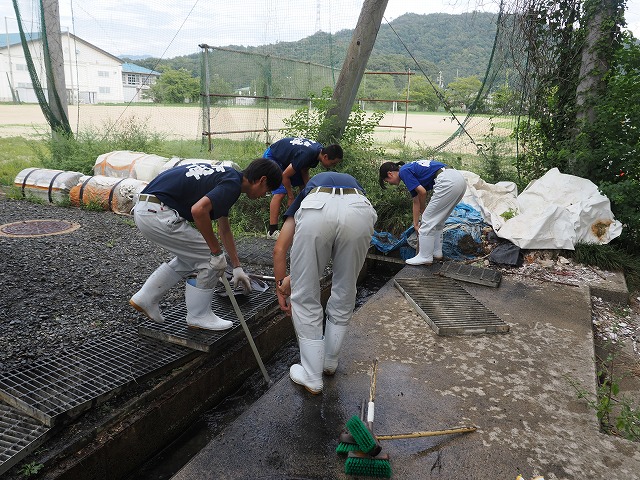 9月12日(金)、栽培環境コース3年生が、総合実習で栽培漁業実習棟の周囲を囲む側溝の掃除を行いました。