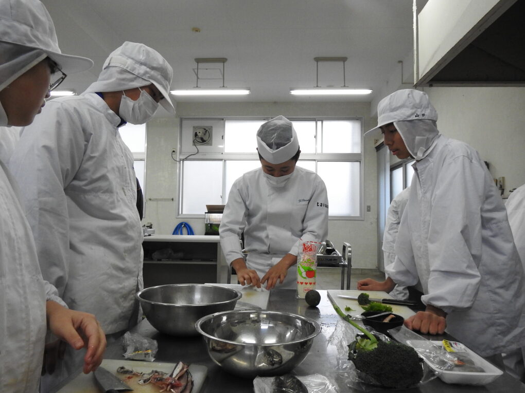 今回は、生徒たちが事前に考案した創作寿司を作るところから見ていただき、作品に細かなアドバイスをいただきました。要所要所でプロの技を見せていただき、生徒たちは感動していました。