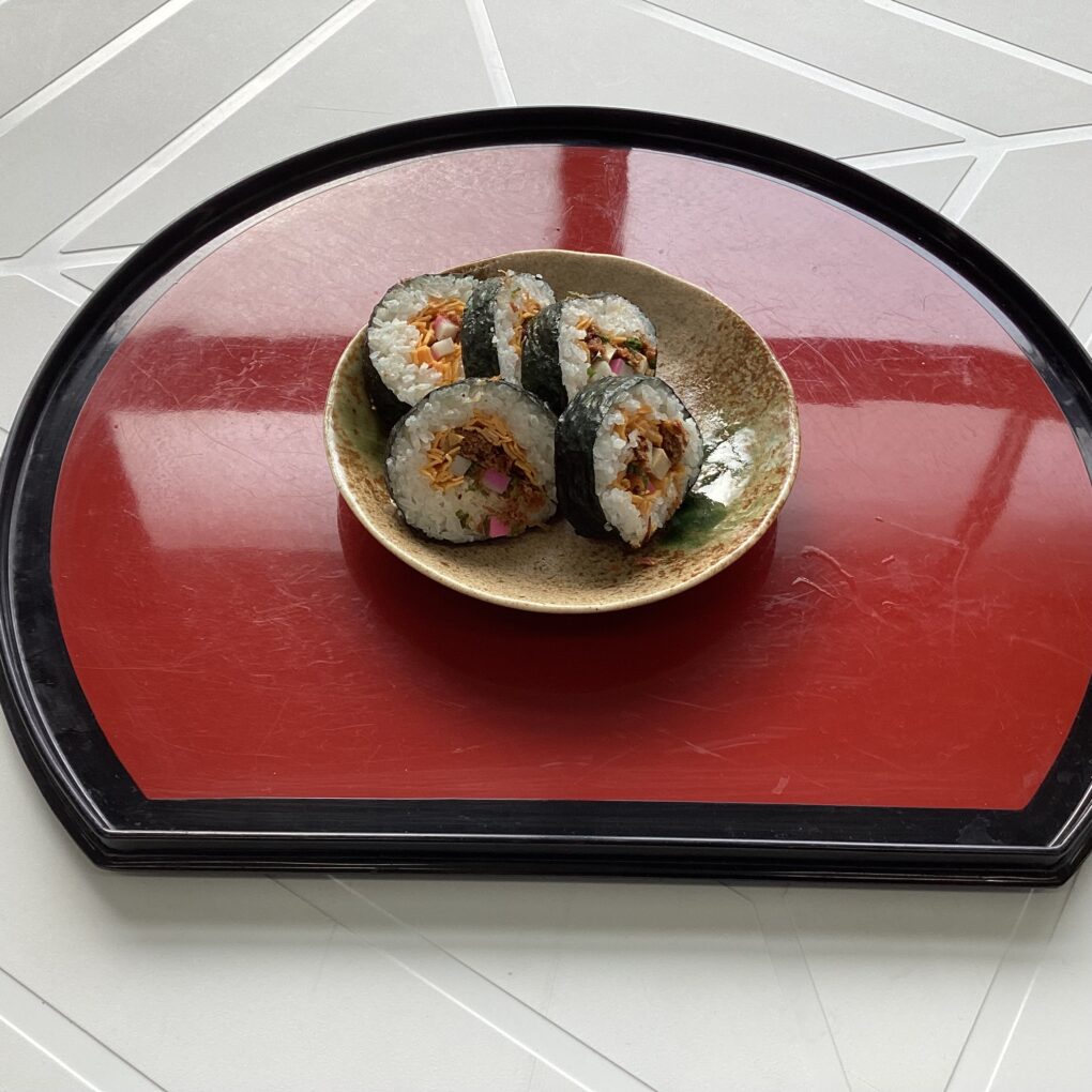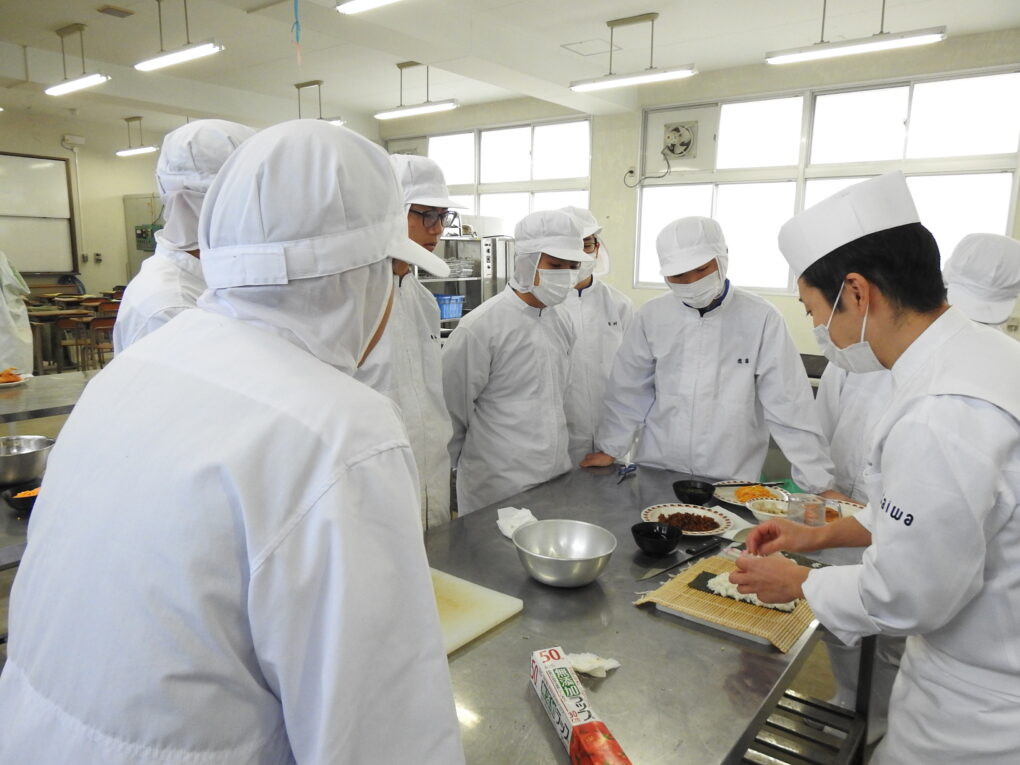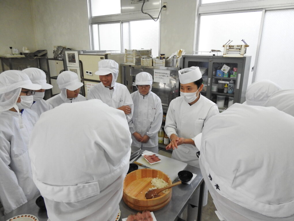 1月15日(木)、食品経済コース2年生の「総合実習」において、京都調理師専門学校から日本料理 伴田 祐耶 様を講師にお迎えし、創作寿司に取り組みました。
