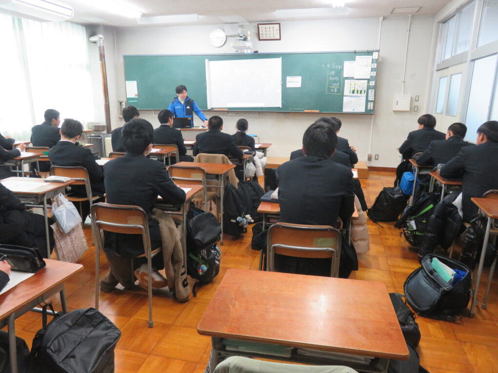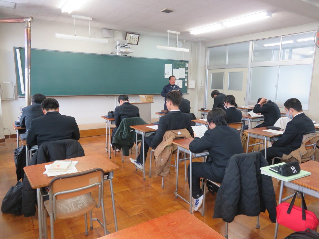現時点での進路希望先として3グループ(①四年制大学 ②短期大学・専門学校 ③就職・公務員)に分かれて、本校進路指導部の教員から講義を受けました。