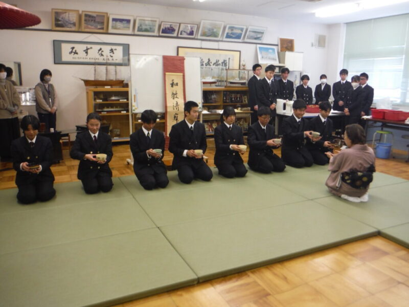 海洋散歩 高校生伝統文化事業の一環で、1年生が1月26日(月)(3組)、27日(火)(1組)、29日(木)(2組)の日程で、茶道体験をそれぞれ行っています。