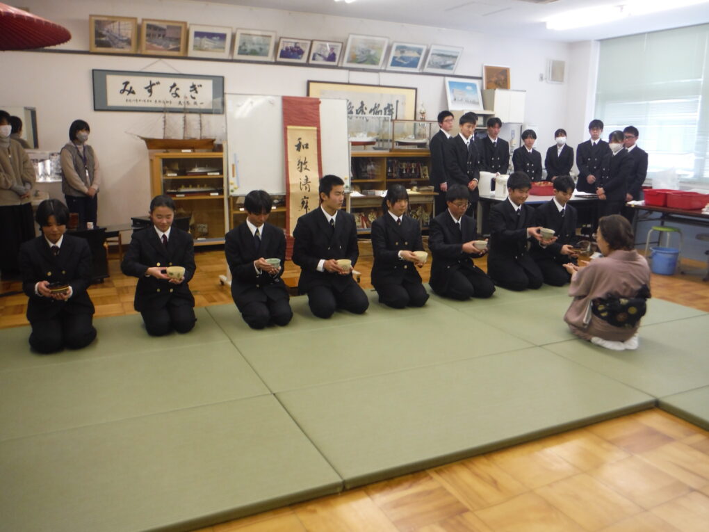 高校生伝統文化事業の一環で、1年生が1月26日(月)(3組)、27日(火)(1組)、29日(木)(2組)の日程で、茶道体験をそれぞれ行っています。
