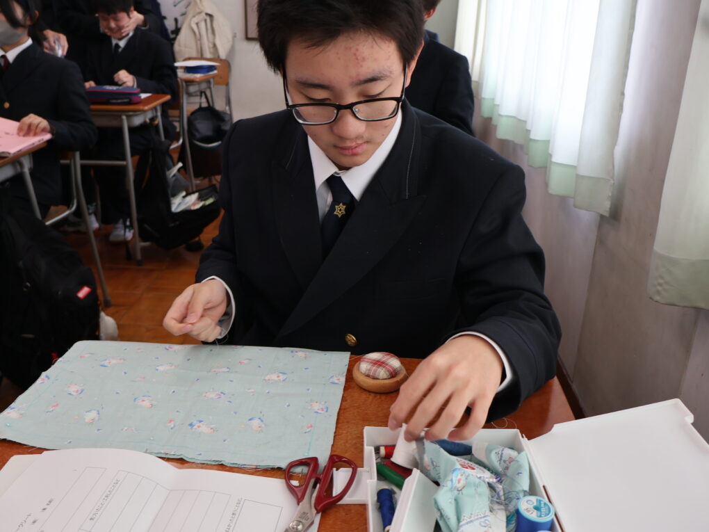 2月3日(火)、1年生は家庭科で裁縫の実習を行いました。まずは生地選びからスタート。思い思いの生地を選んでランチョンマットを作ります。日頃、針を持つことも少なくなってきている昨今、自分の持ち物を自分で作る機会は貴重になっています。生徒たちは慣れない手つきではありましたが、丁寧に生地に針を通していました。