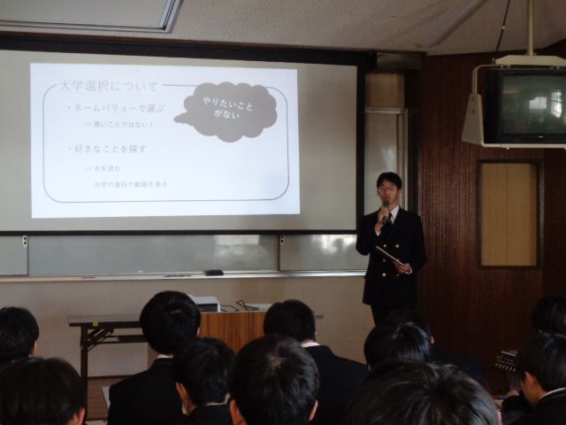 2月4日(水)、海洋科学科2年生及び次年度海洋科学科に所属する1年生が、大学進学が決定した海洋科学科3年生の柴田一吾さん(東京海洋大学海洋生命科学部海洋生物資源学科)から合格体験談(進路メッセージ)を受けました。