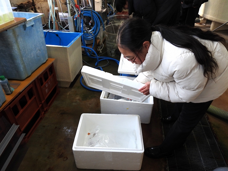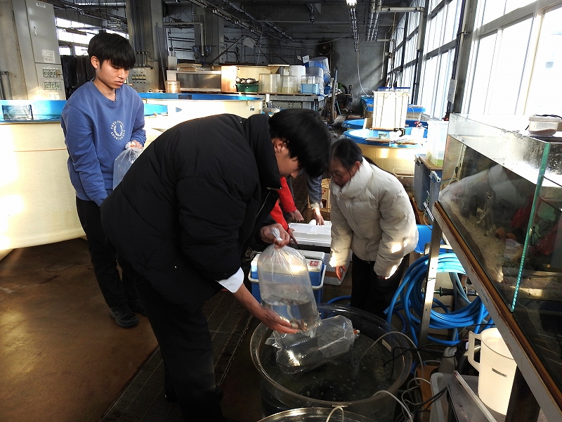 収容水槽に浮かべて水温馴致を行います。