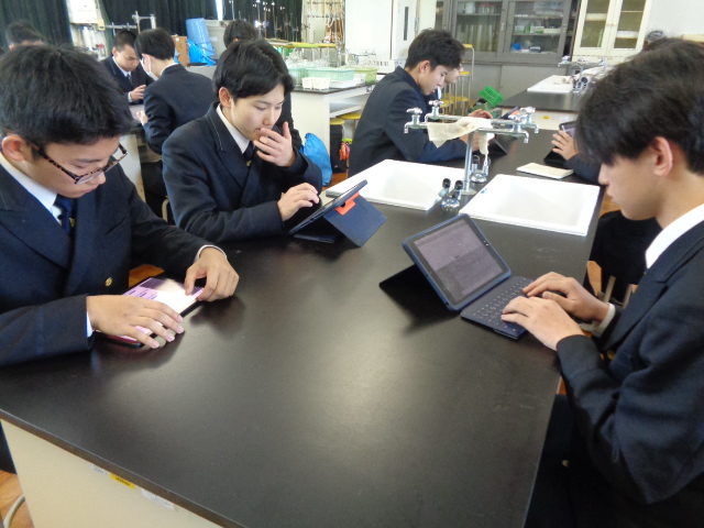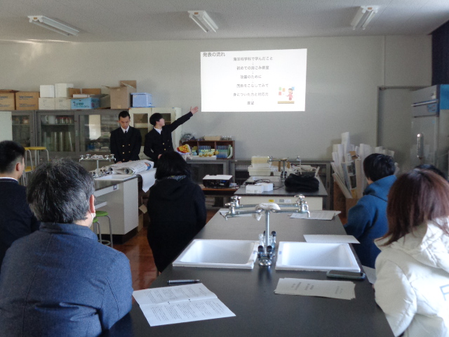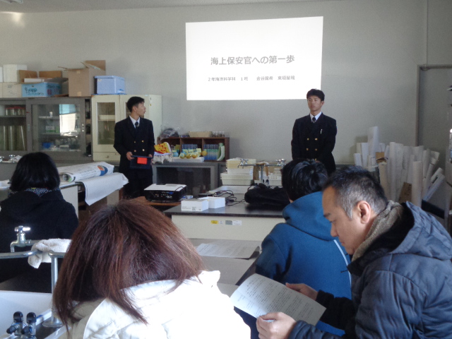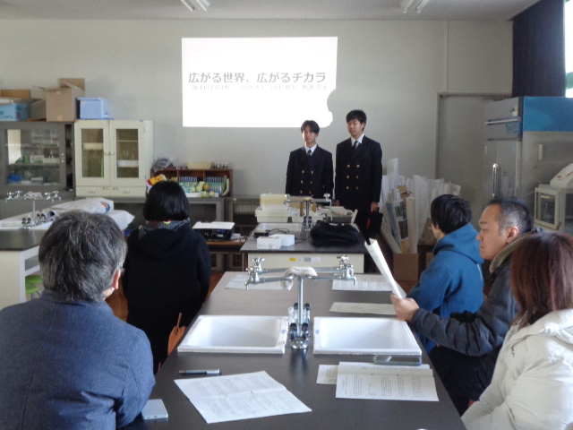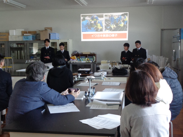 2月13日(金)、PTA年度末総会開催に合わせて授業参観が行われましたが、海洋科学科2年生は「課題研究」の授業で、「学習成果科内発表会」として、保護者向けに1年間の学習成果をまとめ発表しました。