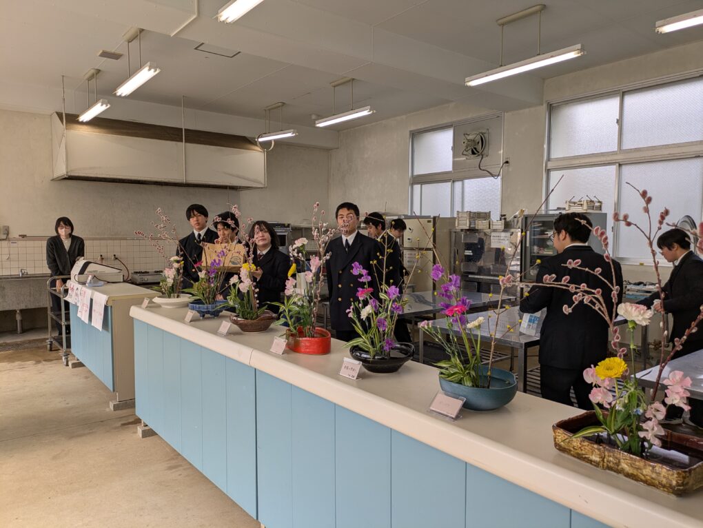 自分たちで生けた季節感あふれる生け花を披露しての華やかな演出の中、中には、我が子が作った「丹後ばら寿司」をお買い求めいただいた方もおられ、準備した54食は完売しました。