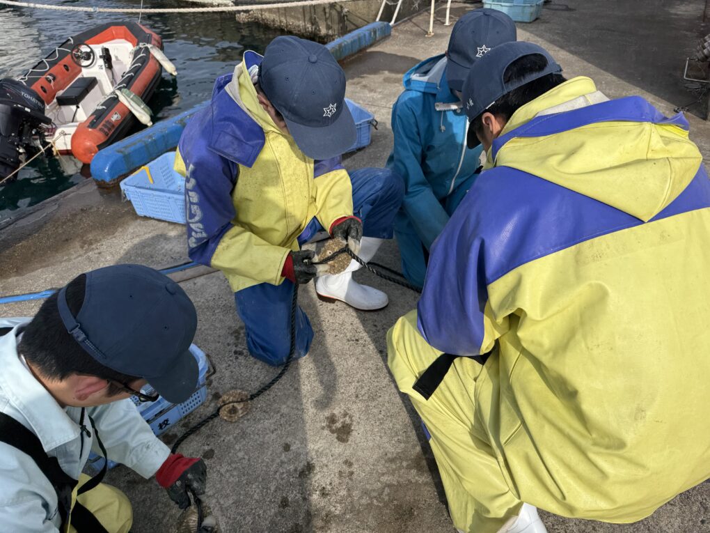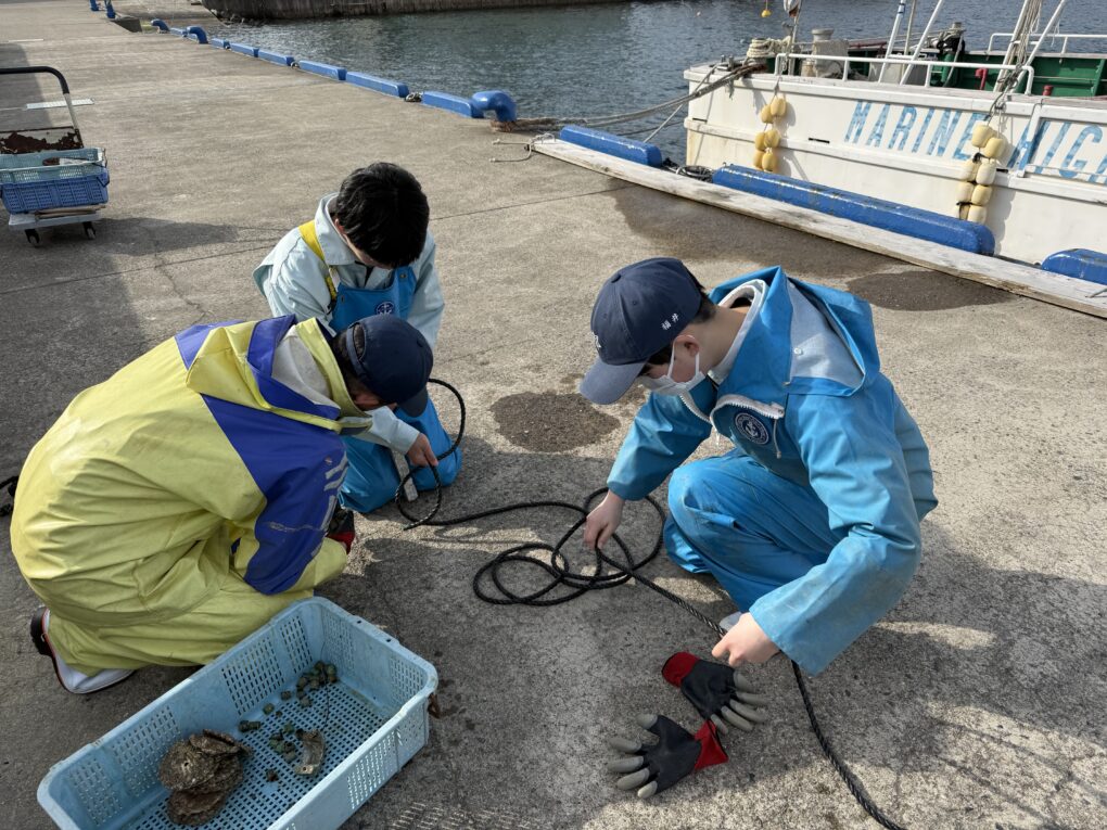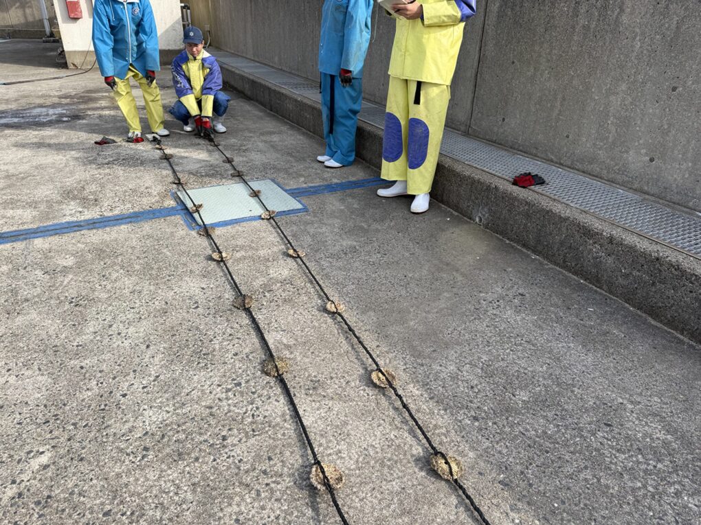 2月24日(火)、海洋科学科2年生の科目「総合実習」で、本校の桟橋で採苗中のイワガキ採苗器を引き上げ、イワガキの付着状況を調査しました。